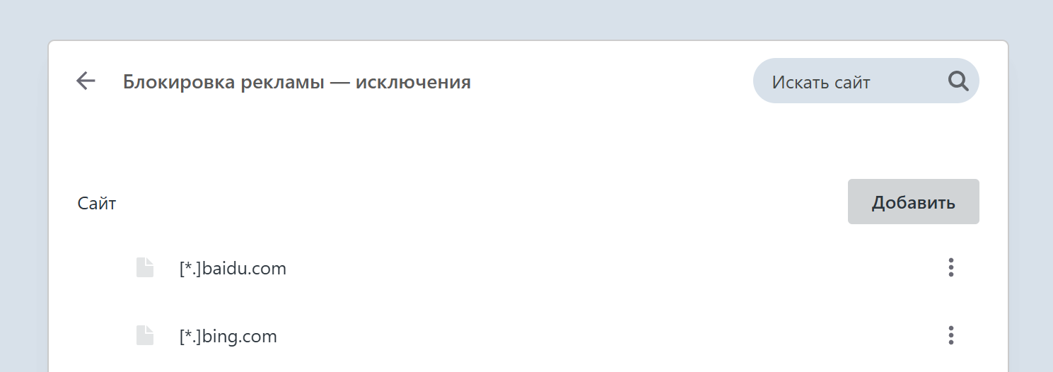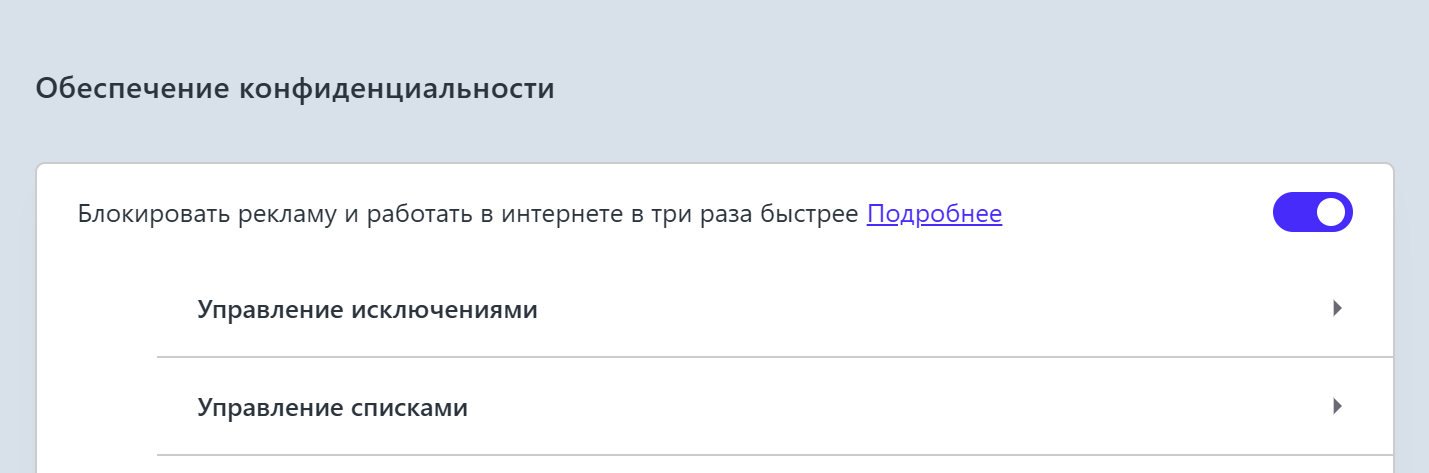 Ниже пункта с текстом "Блокировать рекламу и работать в интернете в три раза быстрее" выберите "Управление исключениями".