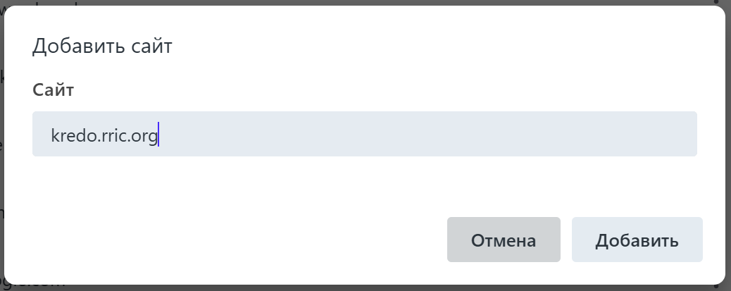Нажмите кнопку "Добавить" и введите адрес сайта "kredo.rric.org".